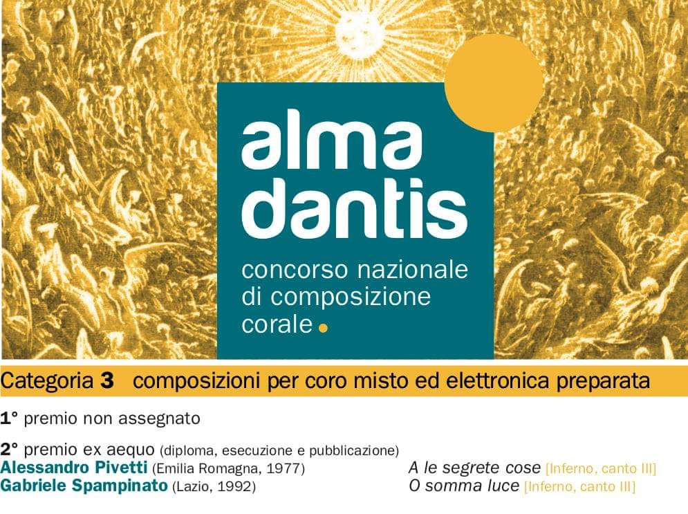 Condivido un’importante soddisfazione personale: il mio pezzo per coro “A le segrete cose”, su testo di Dante Alighieri, è arrivato secondo ex aequo al concorso nazionale Alma Dantis (Feniarco, Siae, Ministero della Cultura, Società Italiana di Musica Contemporanea, Società Dantesca Italiana) e sarà eseguito, in prima assoluta, in un pubblico concerto presso l’Auditorium Parco della Musica di Roma. Un grazie sentito al mio maestro Paolo Aralla che, oltre ad avermi insegnato che la musica si scrive con la gomma e non con la matita, mi ha avviato alle gioie e ai dolori di Max-Msp e all’elettronica musicale. Grazie a chi mi ha sostenuto da sempre nel percorso musicale, famigliari, amici e insegnanti, alla commissione del concorso e al Coro Giovanile Italiano che eseguirà “A le segrete cose”.